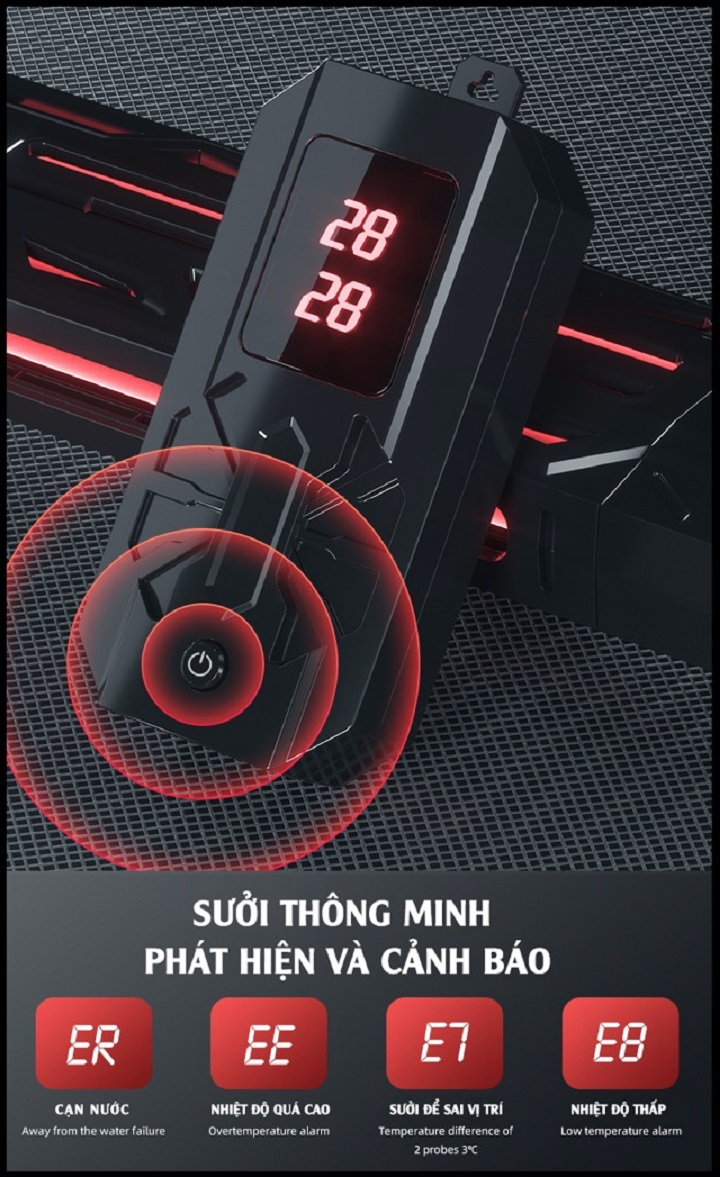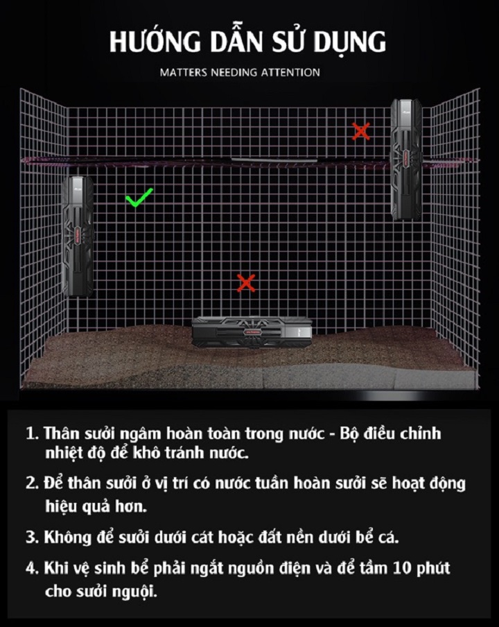 - Đèn báo hoạt động trên sưởi sẽ đóng ngắt liên tục, bạn yên tâm là sưởi không hề hỏng hay trục trặc gì cả. Đây là cách mà sưởi hoạt động: Đốt nóng → phát tán nhiệt độ ra môi trường xung quanh sưởi → cảm biến ngắt khi nhiệt độ xung quanh sưởi đạt tới nhiệt độ cài đặt → nhiệt độ xung quanh sưởi tiếp tục phát tát ra các vùng môi trường xa hơn trong bể làm giảm nhiệt độ môi trường gần sưởi xuống dưới ngưỡng cài đặt → cảm biến bật sưởi để tiếp tục phát tán nhiệt độ ra môi trường xung quanh…và cứ như thế bể cá của bạn sẽ được làm ấm lên từ từ. Có thể mất 12-24h để nhiệt độ trong bể đạt được nhiệt độ cài đặt, bạn yên tâm là điều này tốt cho cá của bạn.